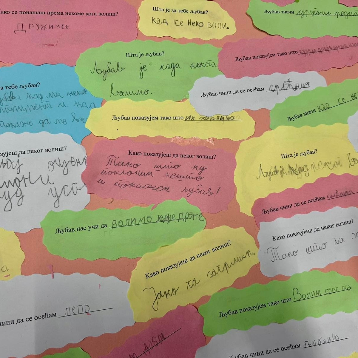 Ученици Вршњачког тима припремили су активност за ученике другог разреда на тему љубави. Њихови занимљиви и искрени одговори сада красе хол наше школе и показују како наши најмлађи описују љубав.